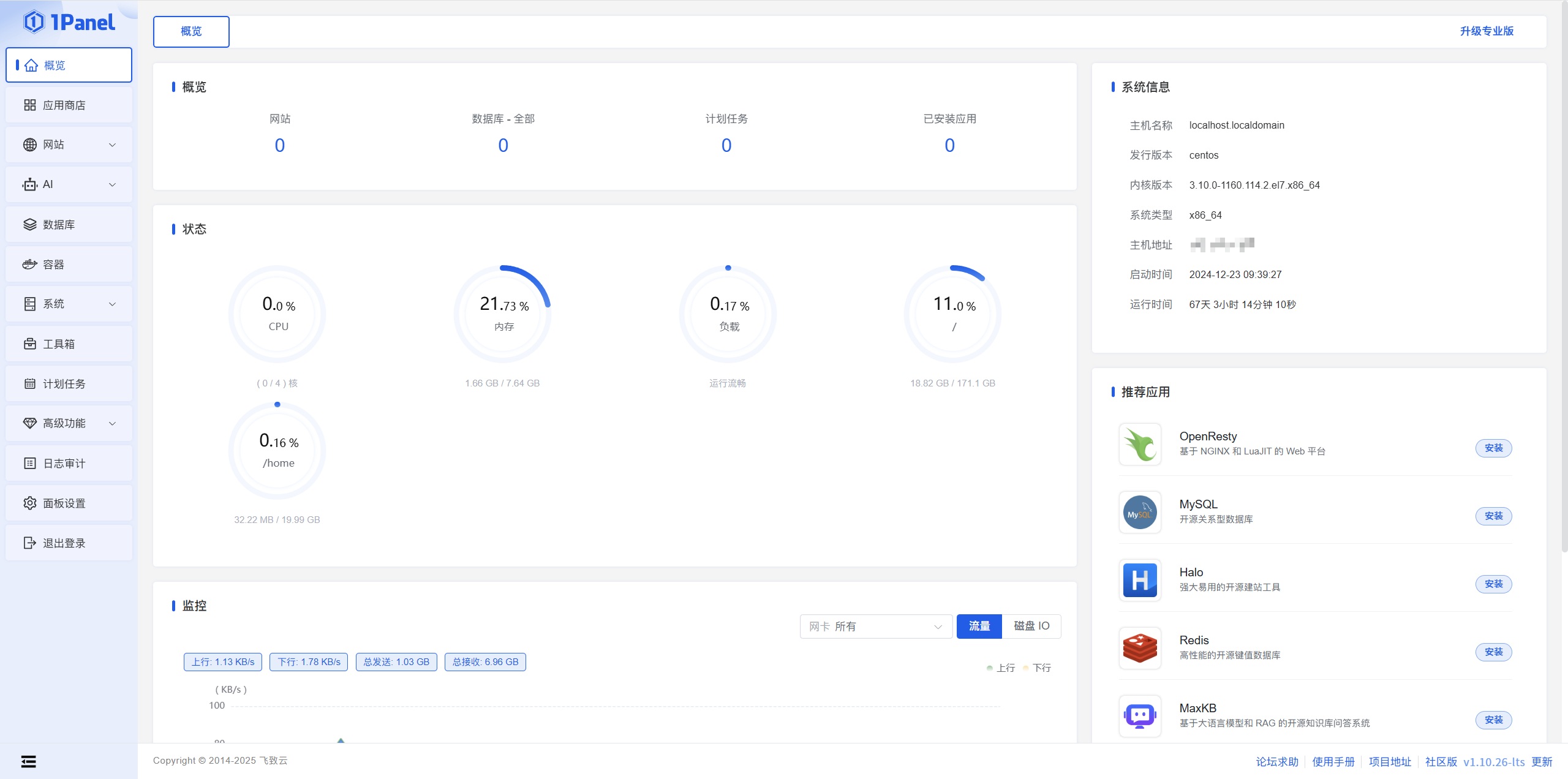安装成功后,可使用 1pctl 命令行工具来维护 1Panel
