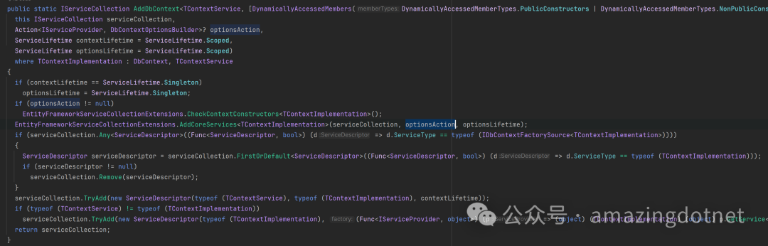 我们可以看到最后注册了一个 IDbContextOptionsConfiguration<TContext> 的服务,类似于 options 模式里的 configure service 一样配置 DbContextOptions 所以我们可以单独注册一个 IDbContextOptionsConfiguration<TContext> 服务来配置 DbContextOptions,给 DbContext 注册 Interceptor,所以我们可以封装一个类似下面这样的方法:
