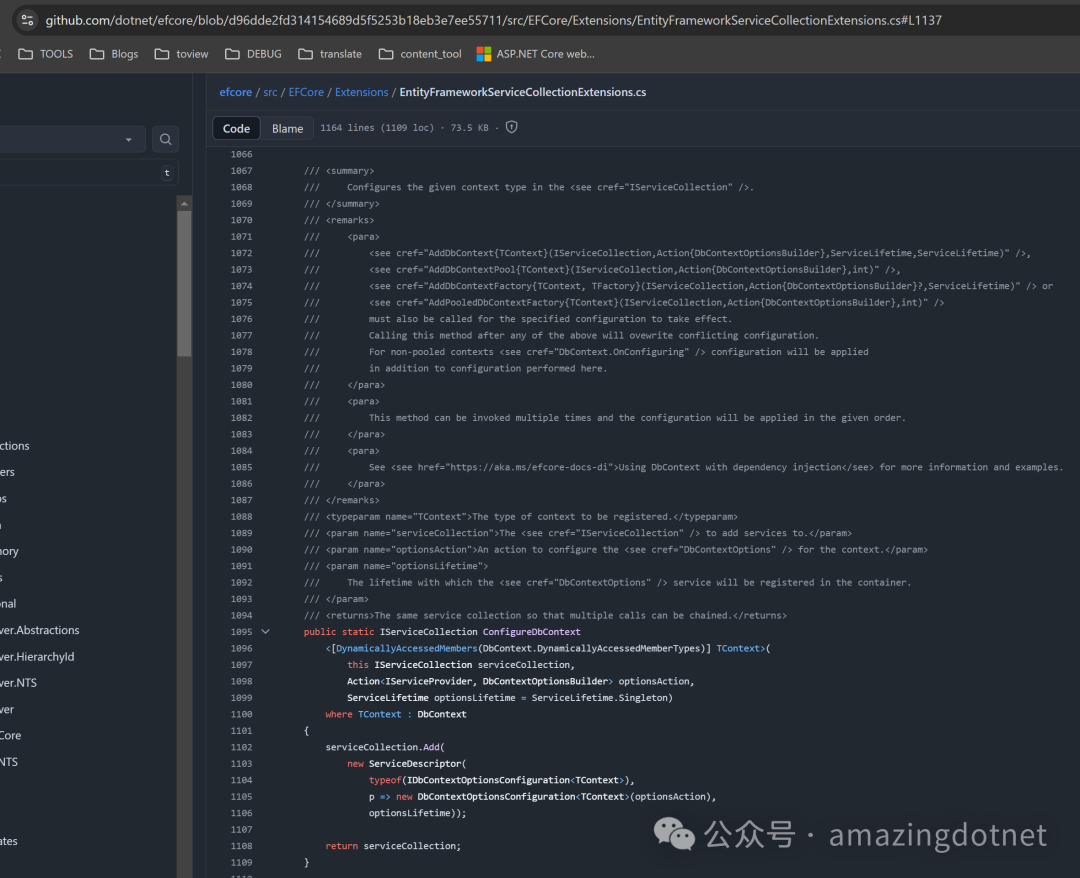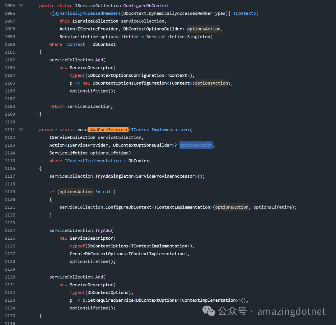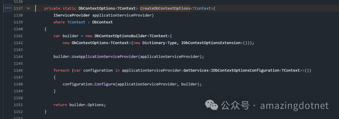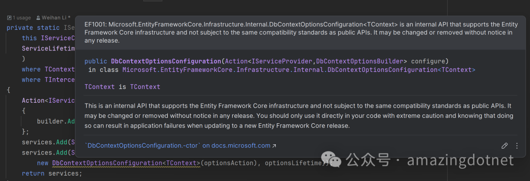 因为这个 DbContextOptionsConfiguration 是 EF 内部的一个类型,虽然这个类似是 public 但是,不建议直接使用,后续版本可能会发生破坏性的变更,我们可以忽略这个警告,或者自己实现一下这个类型,也比较简单,实现如下: