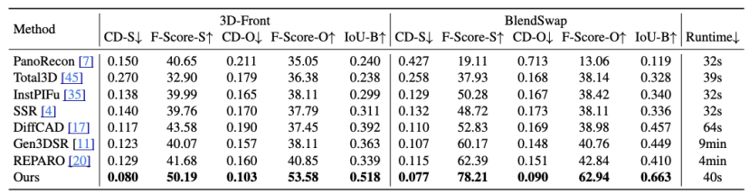 MIDI 的主要特点在于其精确的空间布局建模、卓越的几何生成质量、生成的高效性和广泛的适用性。实验结果显示,该模型在多个数据集上的表现超越现有方法,包括 3D 实例间的空间关系、3D 实例生成的几何质量、以及端到端的生成速度均取得了优异的表现。
