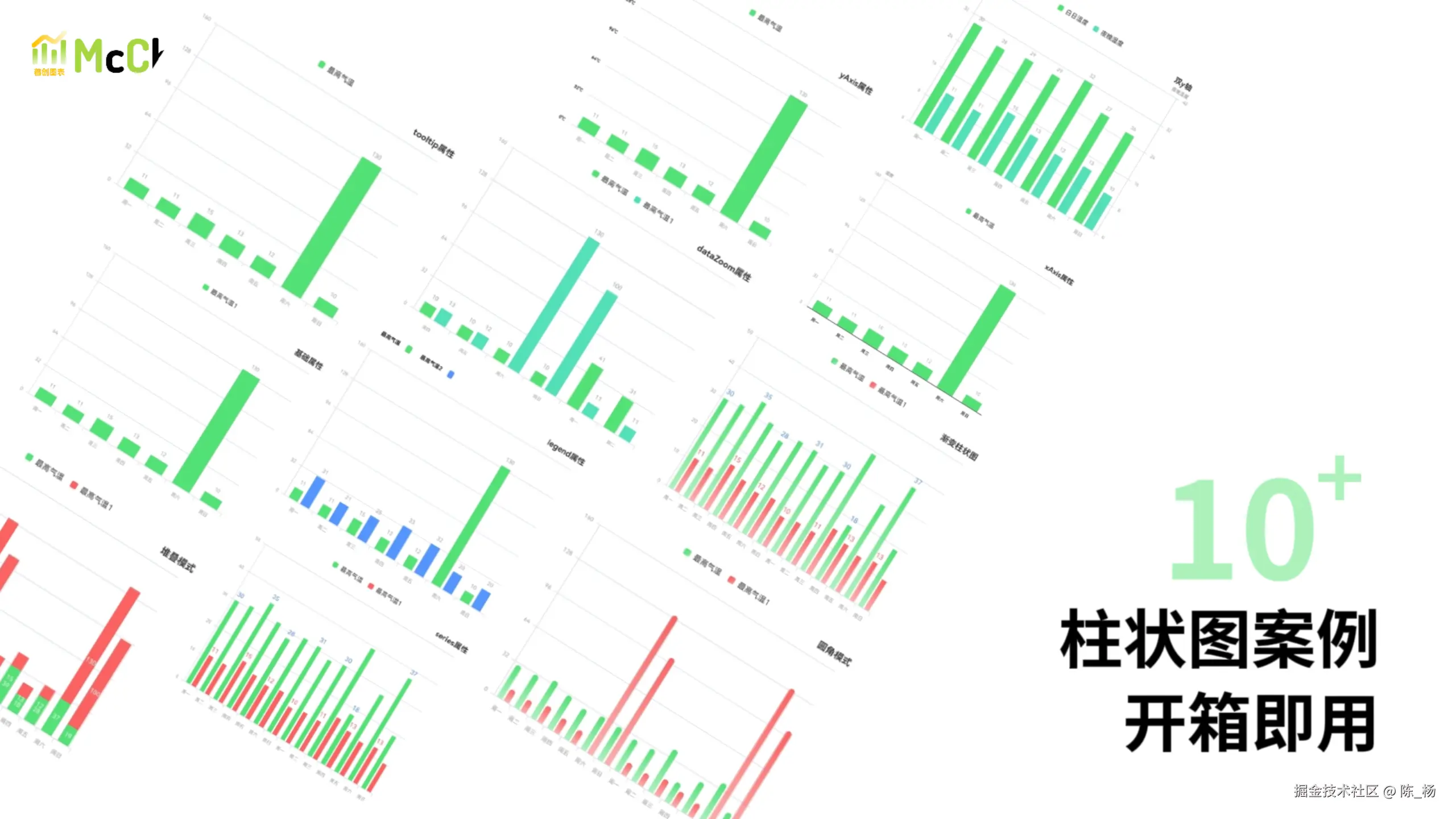 柱状图在此次版本中新增了多条 Y 轴的展示以及渐变模式等多种场景,案例目前已有十几种