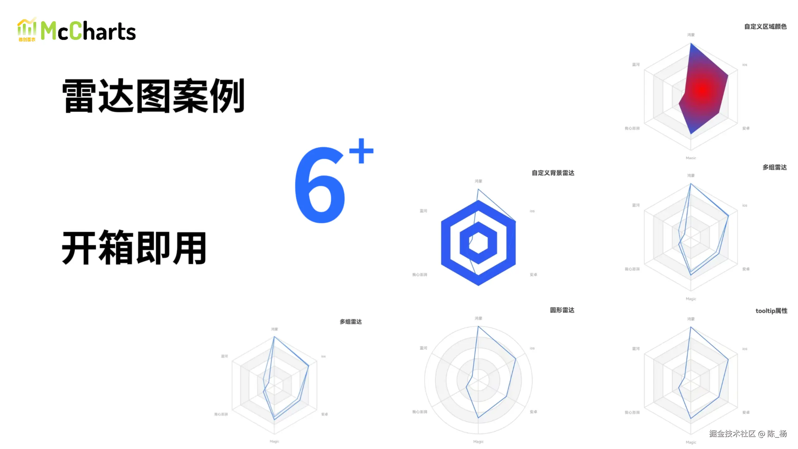 雷达图在此次更新中新增了圆形模式与指标多元化的场景、以及优化了动画效果,案例已到达 6 个以上