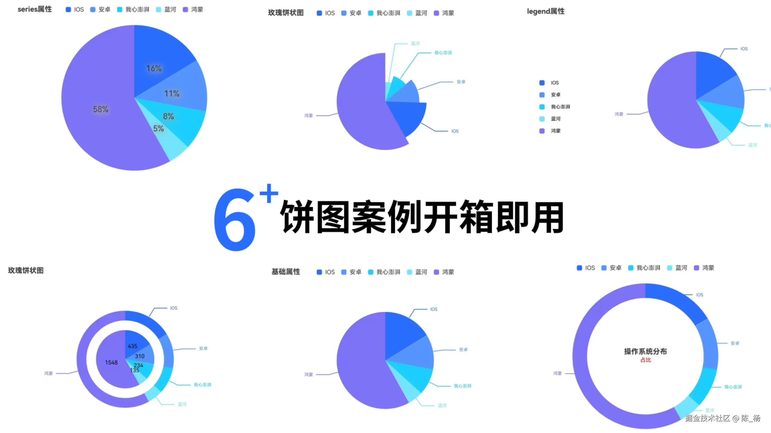饼图在此次更新中新增了玫瑰图与多饼图组合模式等场景、以及优化了动画效果,案例已到达 6 个以上