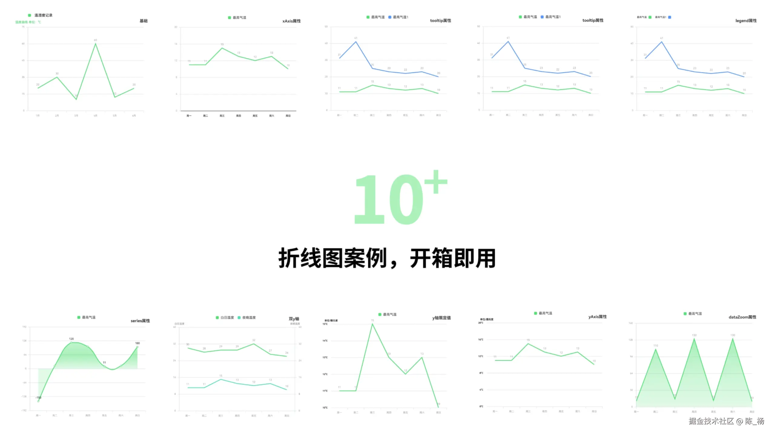 折线图在此次版本中新增了多条 Y 轴的展示以及优化了动画、图例可控制显示隐藏等,开箱即用的案例目前已有十几种