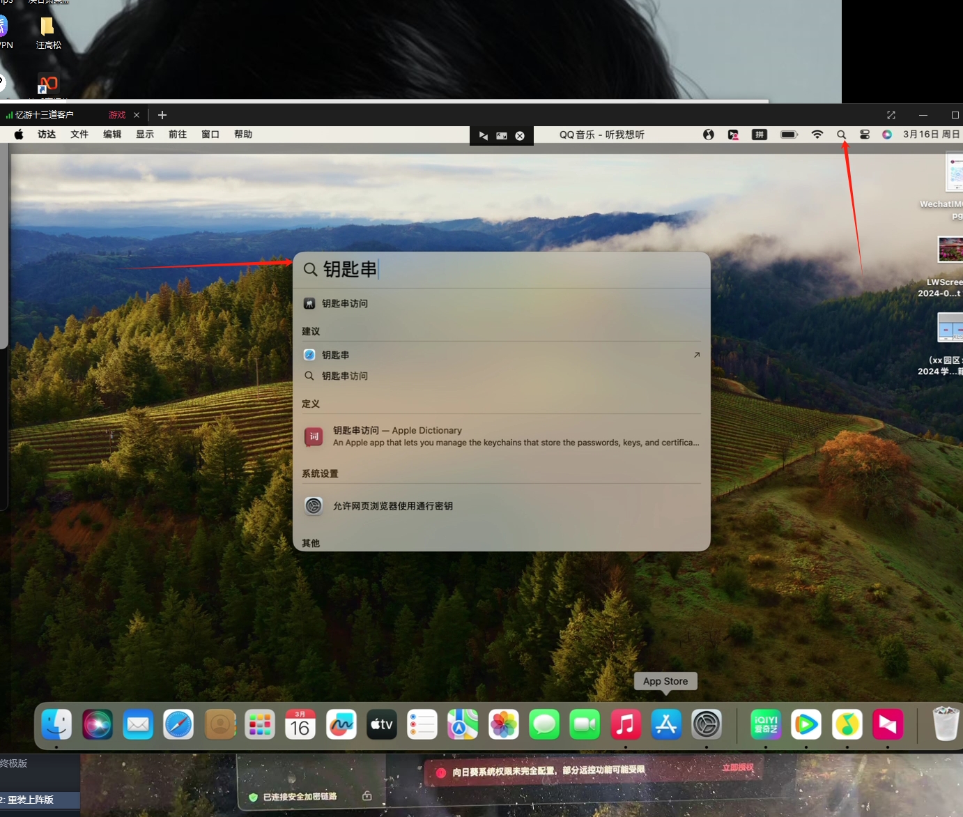 1.在苹果电脑的“聚焦搜索”(点击菜单栏右上角的放大镜图标 )中输入“钥匙串访问”,然后打开该应用程序。