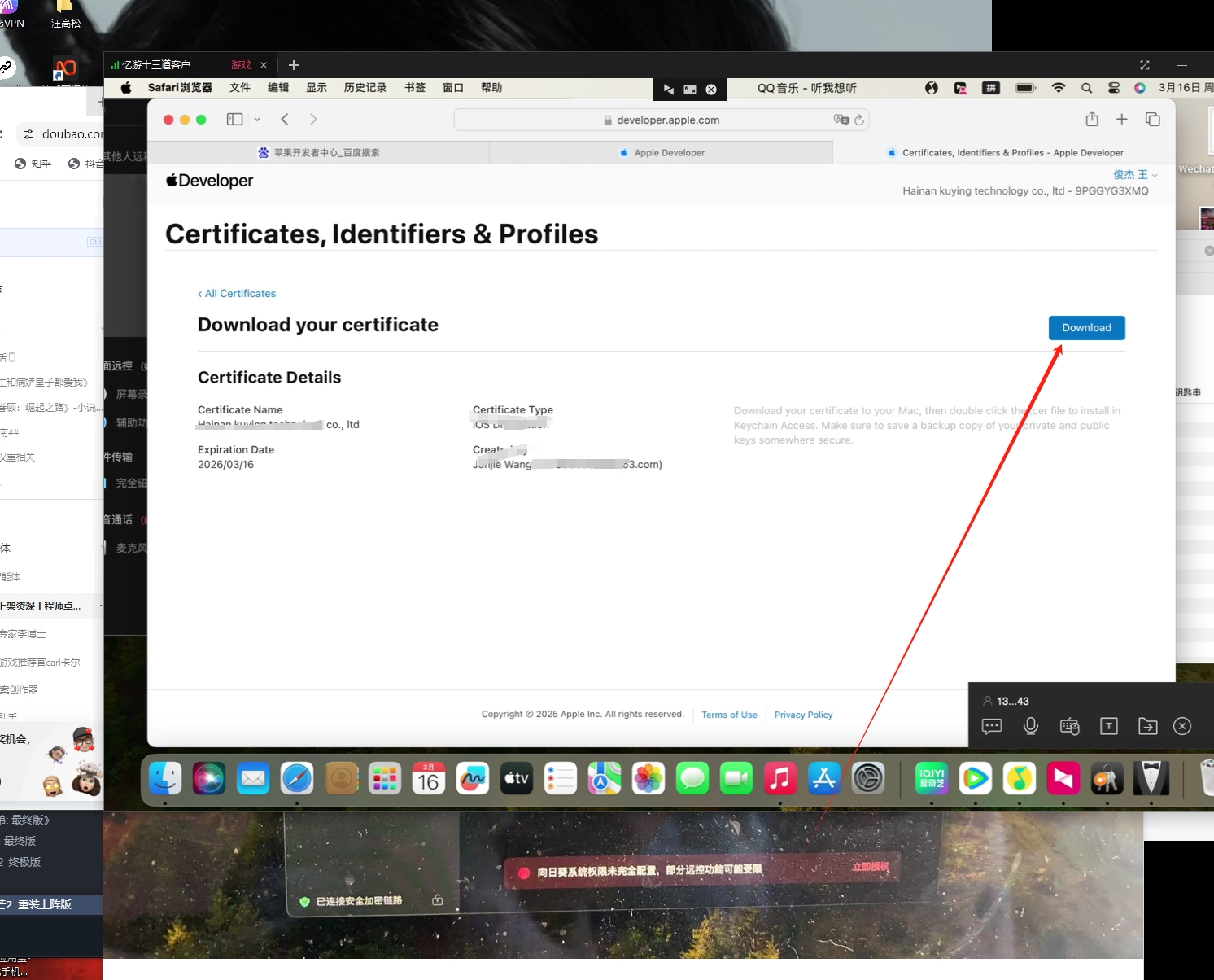 7.生成后,点击“Download”(下载),将证书文件(通常为.cer格式)保存到本地。