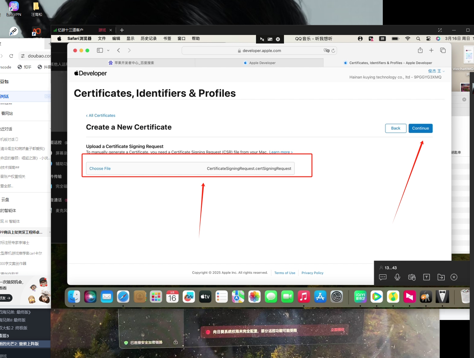 - 点击“Choose File”(选择文件),找到并上传你刚刚在钥匙串访问中创建的`.certSigningRequest`文件 。