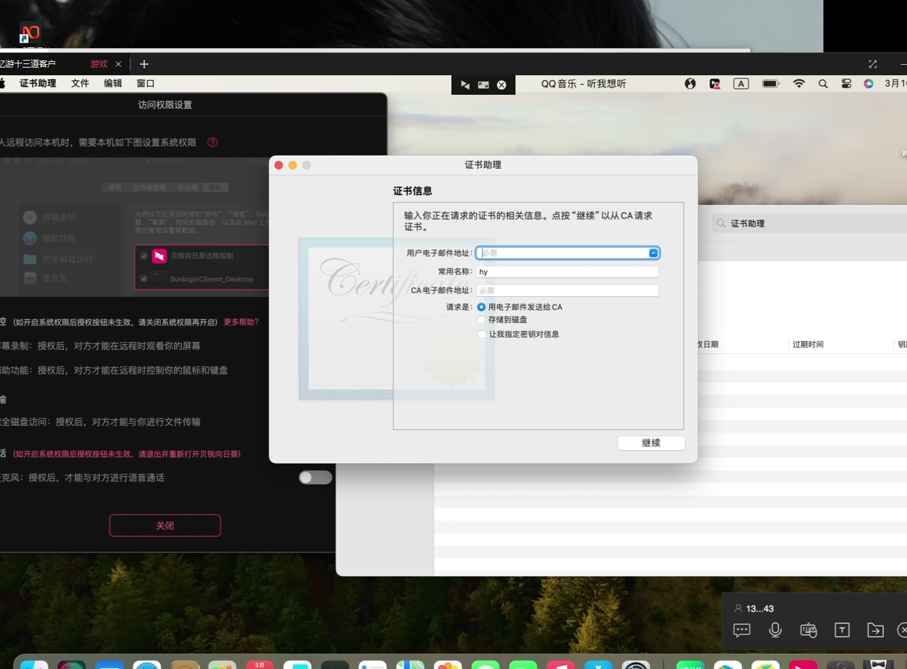 1.在“钥匙串访问”应用中,依次点击菜单栏的“钥匙串访问”>“证书助理”>“从证书颁发机构请求证书” 。