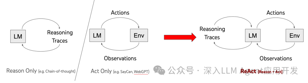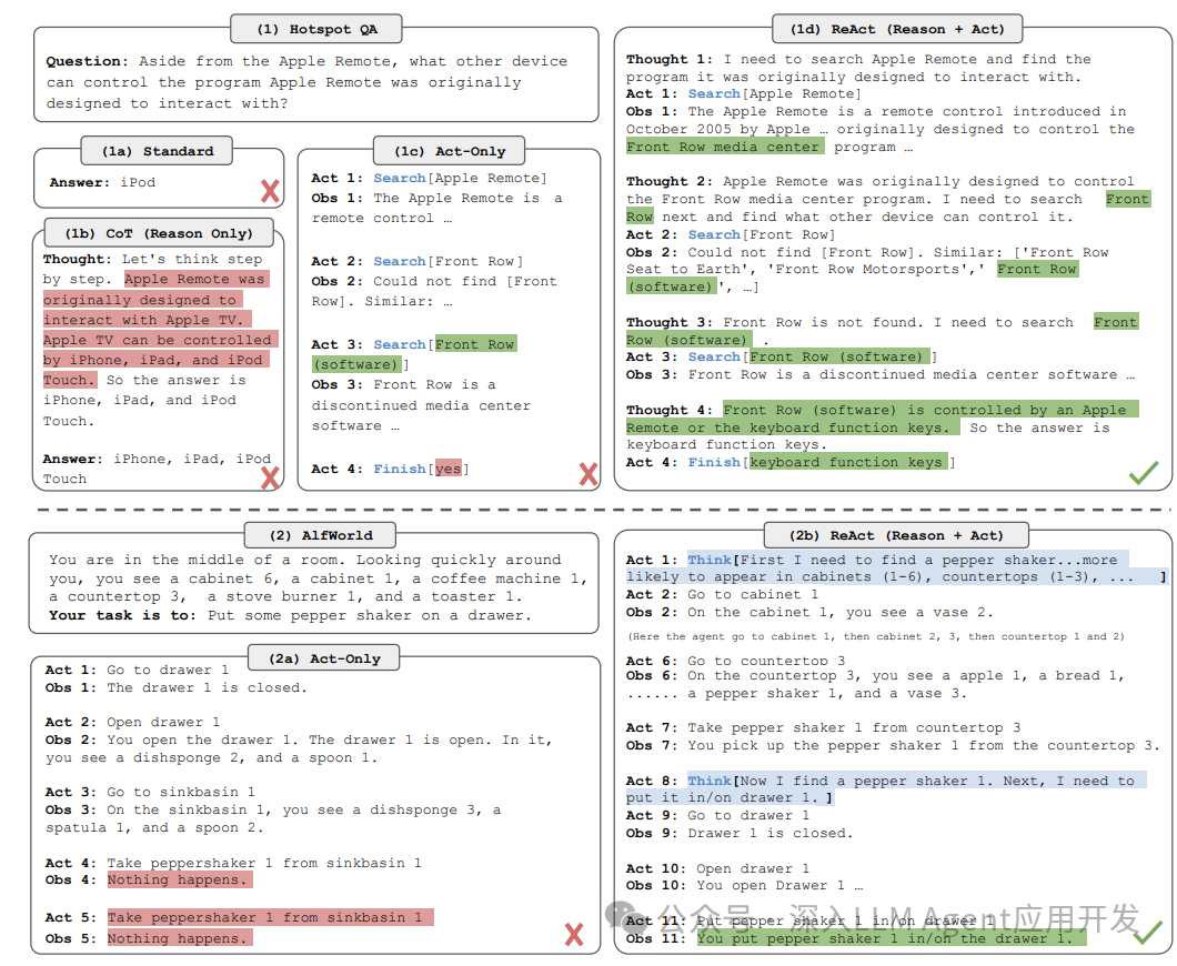 用交替进行的"思考、行动、观察"三个步骤来解决问答任务。思考可以对当前情况进行推理,而行动必须是以下三种类型: