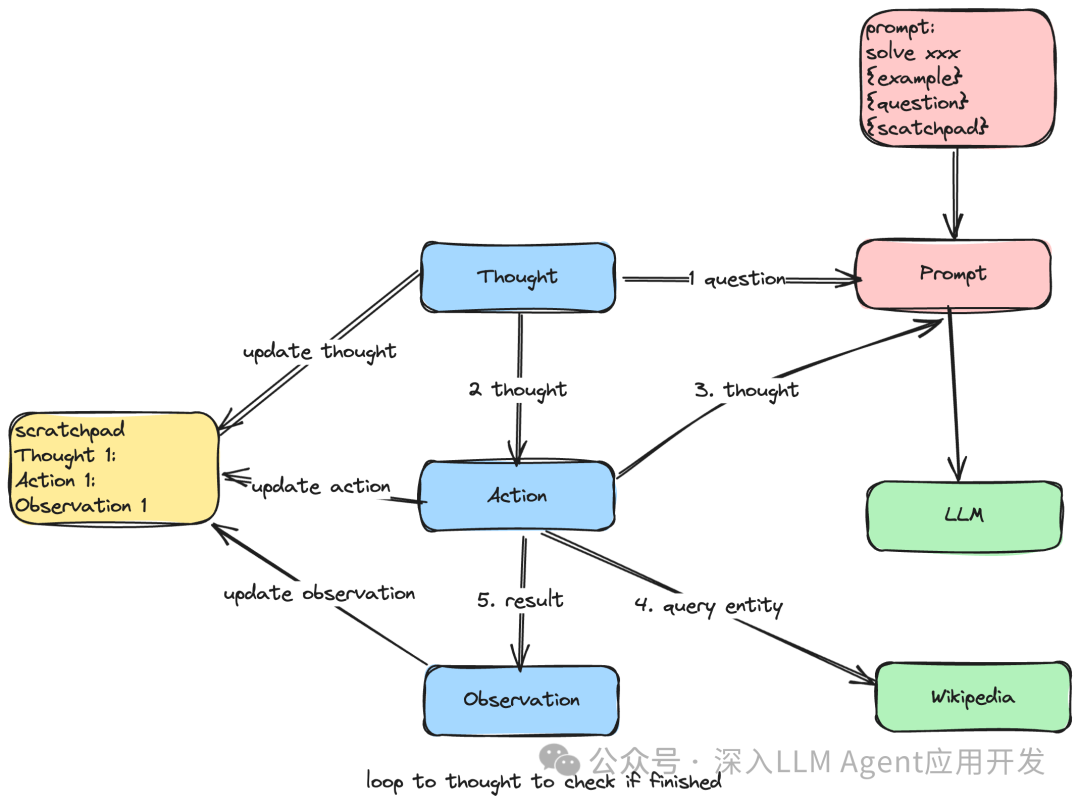 LLM会根据Prompt对问题进行针对性推理,即根据问题推断出应采取何种行动,并提供Thought的推理结果。在这一设计中,我们要求LLM在遇到第一个换行符时停止,以防止其根据Example回复Search、Lookup和Finish,这一设计依赖于Example中的格式。接下来,我们将Thought与Prompt结合再次输入LLM,LLM将基于此进行进一步推理,确定应采取何种行动,从而对Thought中的想法进行总结提炼,决定是执行Search、Lookup还是Finish操作。随后,我们调用工具进行维基百科搜索以获取实体。在Observation阶段,我们会获取工具返回的结果,再次进入Thought以便确定是否找到了问题的答案。若找到了,给出Action Finished;若未找到,则根据Observation的结果或相似内容进行思考,然后在Action阶段开始检索。通过一次次地迭代,最终获得答案。