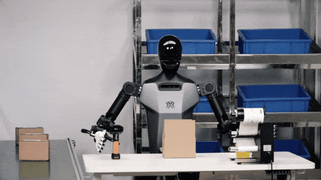 「天工」机器人左右手分别拿起物品和扫码枪,通过头部相机确认物品条形码位置,双手协同完成扫码、装箱、封箱及粘贴快递标签等一系列操作,最终将包装箱放于物流传送带上。