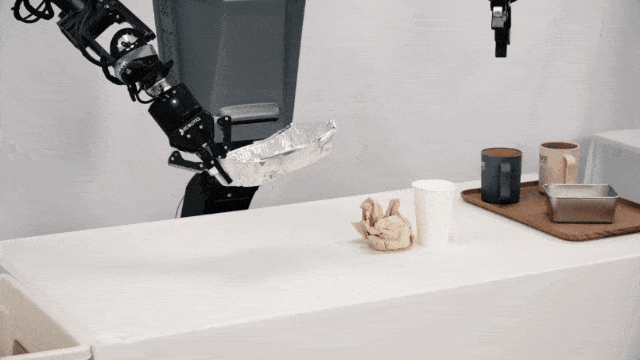 在一镜到底的数分钟展示中,「天工」机器人完美实现了双臂协同桌面流畅整理,面对不同的桌面杂物布局,在被多次随机的人为打断或者移位干扰情况下,依然能够精准识别桌面物品并实时反应、动态调整、自主重试,流畅丝滑、锲而不舍地完成桌面上各类杯子、盒子、纸团等杂物的收纳放置。