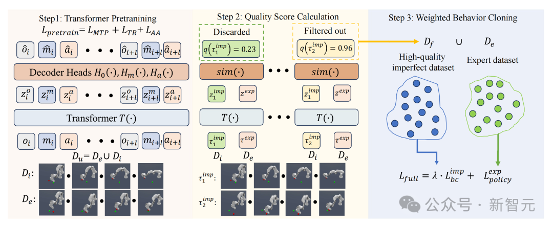 此外,为了更好地实现操作过程中的抗干扰能力和错误恢复能力,北京人形机器人技术团队提出了一种自监督数据过滤框架(SSDF)[2]从失败数据中提取有价值的信息。该框架通过结合专家数据和失败数据来计算失败轨迹段的质量分数,并筛选出高质量的失败数据片段用于训练。