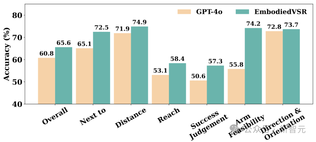 除了视觉语言问答相关评测之外,北京人形机器人还构建了适用于具身智能的评测集,能够在空间相对位置、距离、成功失败判断、可达性以及可操作性等维度进行了评估,采用「慧思开物」具身智能平台相比单纯调用GPT-4o等多模态模型在具身智能能力上也有很大提升。