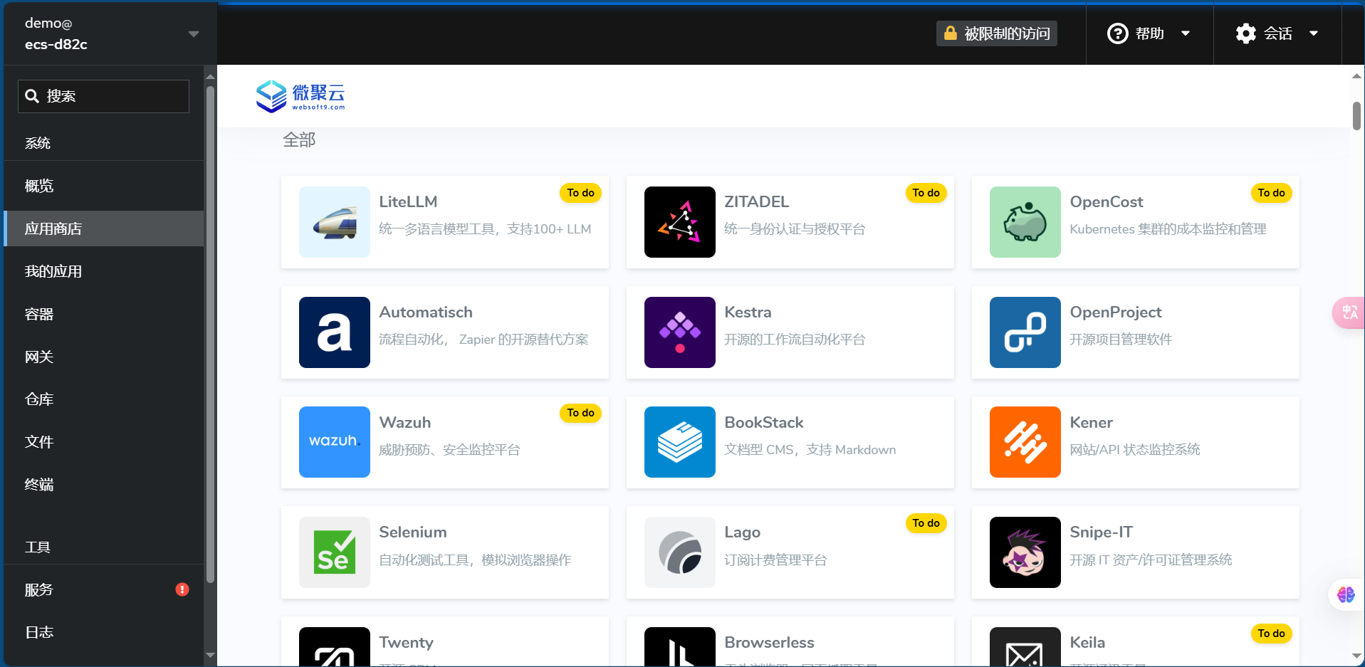 应用模板库 | 200+预配置模板,含开发框架与企业系统 | 通用型插件为主 | 依赖Docker Compose编排 | 侧重基础服务管理 |