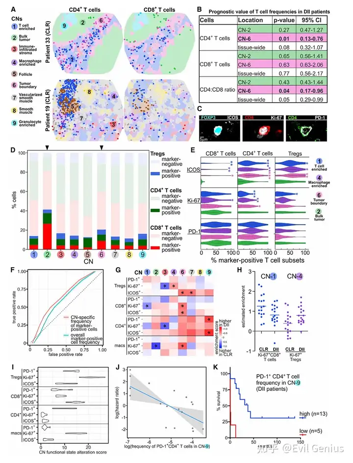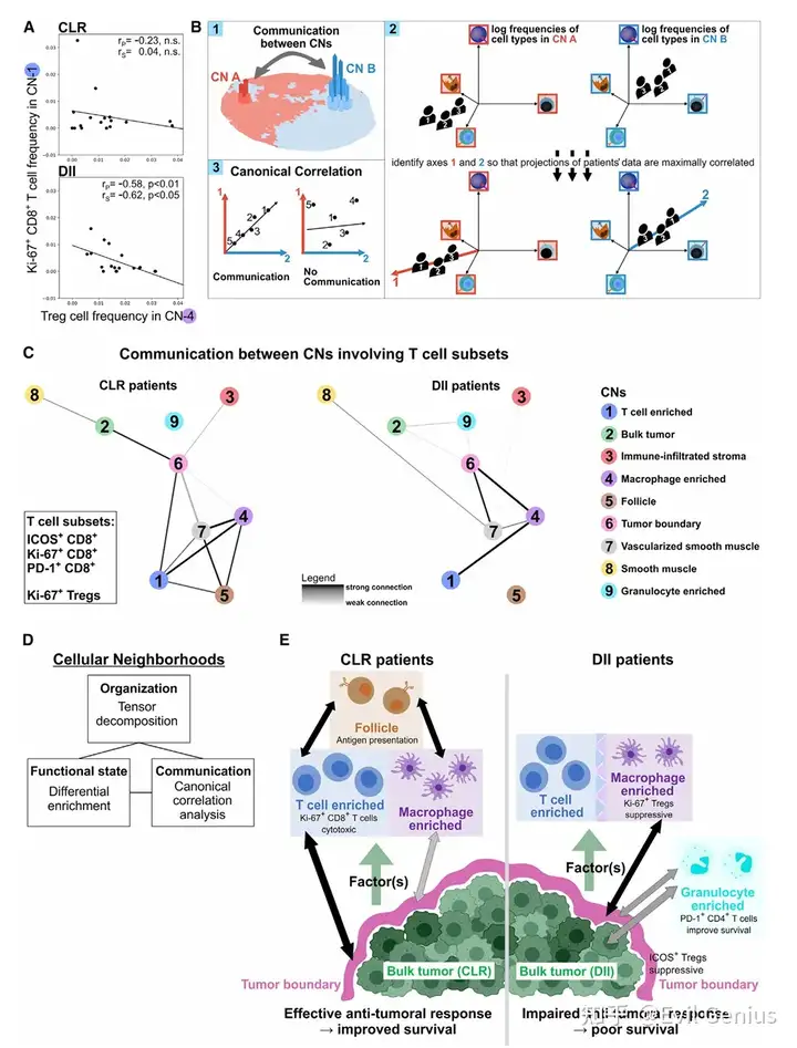 总之,在DII患者中,相关性分析使我们能够观察到CN-1(富含T细胞)和CN-4(富含巨噬细胞)之间可能的免疫抑制程序。此外,CN之间关于功能性T细胞亚群的通信网络在患者组之间发生了改变,其方式表明这种免疫抑制程序可能影响肿瘤边界和bulk肿瘤中功能性T细胞亚群的表型。CN-1和CN-2之间的空间接触增加,以及在分析中观察到的CN和CT组织的变化可能在这些患者的受损结局中发挥作用。