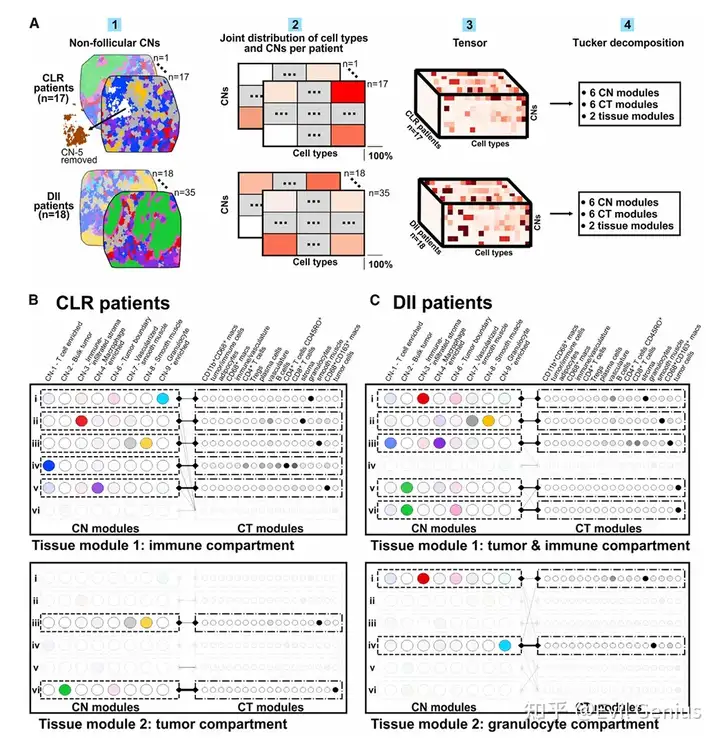 如果一个CT的功能状态与另一个CT的功能状态相关,则可以推断出某种东西正在介导这种相关性;也就是说,这些CT“通信”。CN也是如此,并且能够推断CN间通信网络. CN间通信中患者组之间的变化可以揭示肿瘤如何调节iTME以及治疗干预的可能性。