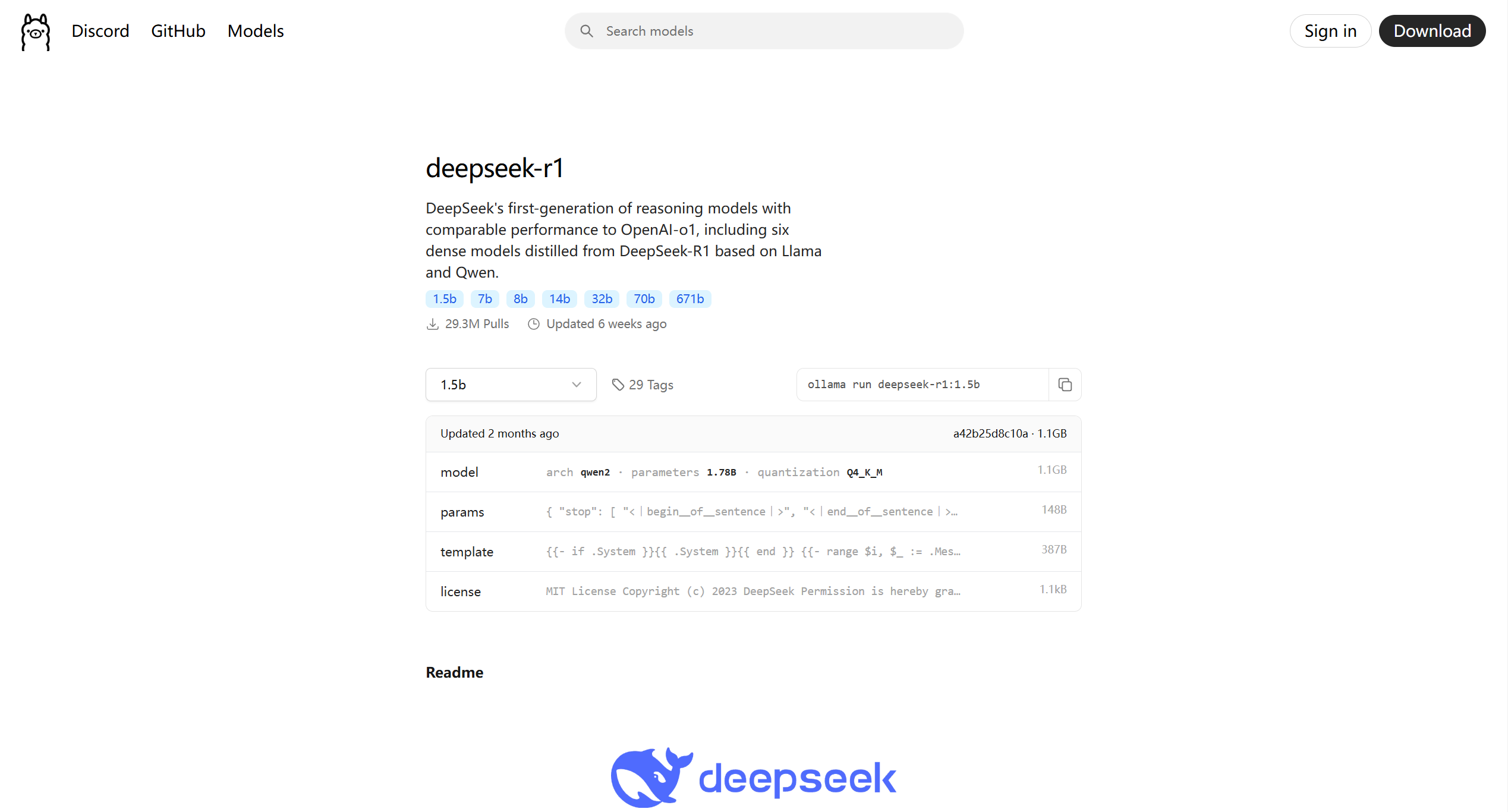 ghcr.io/open-webui/open-webui:main访问Ollam的模型库,您将发现多种DeepSeek-R1模型版本,包括1.5B、7B、14B、32B等。选择适合服务器配置的版本,这次以1.5为例。