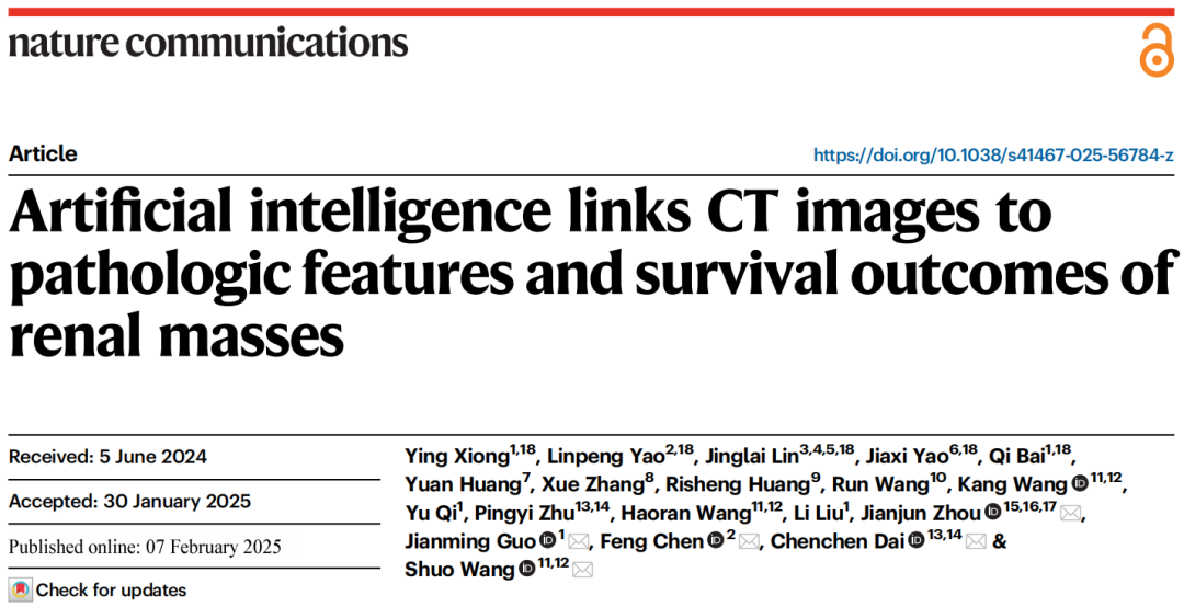 Xiong Y, Yao L, Lin J, et al. Artificial intelligence links CT images to pathologic features and survival outcomes of renal masses[J]. Nature Communications, 2025, 16(1): 1425.