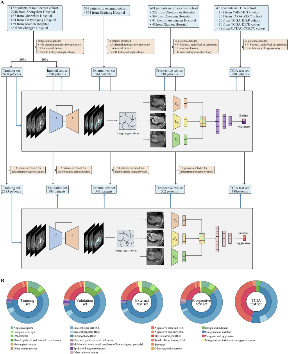 图1A展示了患者筛选和分组的详细过程。总共有4557名接受肾脏手术且进行过术前增强CT扫描的患者参与研究。这些患者被分为五组:训练集(2400人)、内部测试集(598人)、外部测试集(561人)、前瞻性测试集(610人)和TCIA测试集(388人)。研究将肾脏肿块分为三类:良性惰性型(对健康威胁较小)、恶性惰性型(虽为癌症但发展缓慢)和恶性侵袭性型(发展迅速需要及时治疗)。在大多数研究组中,这三类患者的比例相对稳定:良性惰性型约占15-17%,恶性惰性型约占61-63%,恶性侵袭性型约占20-21%。只有TCIA测试集的构成略有不同,其中恶性侵袭性型患者比例较高,达到45.4%。图1B则直观地展示了各组患者中不同类型肿瘤的具体分布情况,帮助我们更好地理解患者群体的构成特征。这种详细的分组数据为评估人工智能诊断模型的准确性提供了重要基础。