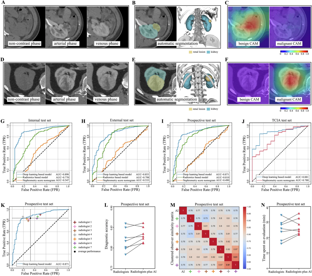 今天为大家介绍的是来自复旦大学中山医院泌尿科郭剑明教授团队发表的一篇论文。在临床实践中,当医生意外发现患者的肾脏有肿块时,往往难以确定其性质,这给治疗方案的选择带来了挑战。要提供更精准的治疗方案,关键在于能够准确判断肿块是良性还是恶性,以及在恶性情况下肿瘤的危险程度。研究团队收集了4557名患者的13261份术前CT扫描影像,开发出两个基于人工智能的诊断模型。第一个模型用于判断肾脏肿块是否为恶性,其准确度(用AUC衡量)达到0.871,表现甚至超过了7位经验丰富的放射科医生。第二个模型则专门用来区分高危和低危的肿瘤,准确度达到0.783。这两个模型的表现都优于现有的医学影像分析方法。最重要的是,这项研究证明,通过分析术前的多阶段CT扫描图像,人工智能模型可以在不需要手术切片的情况下,准确预测肾脏肿块的性质和危险程度,为医生制定治疗方案提供重要参考。