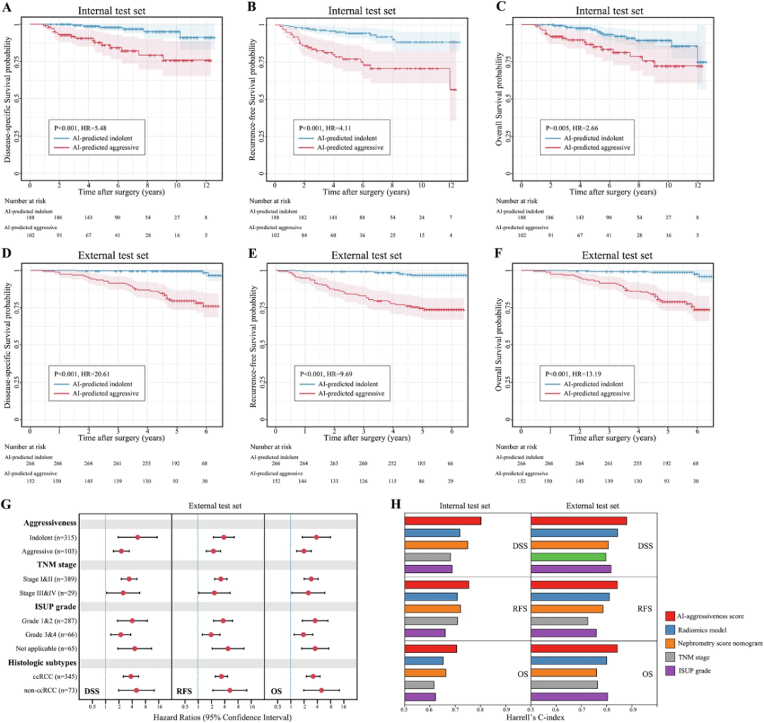 图4G的森林图显示,AI侵袭性评分在不同亚组(包括TNM分期、ISUP分级和组织学亚型)中都与患者预后显著相关。图4H比较了不同预后评估方法的预测价值,结果表明AI侵袭性评分在预测疾病特异性生存率、无复发生存率和总体生存率方面都优于其他风险评估方法。这些发现意味着,AI系统不仅能帮助医生更准确地判断肿瘤风险,还能为患者的治疗决策提供更可靠的参考依据。对于医生来说,这是一个强大的辅助工具;对于患者来说,这意味着可能获得更精准的治疗方案。