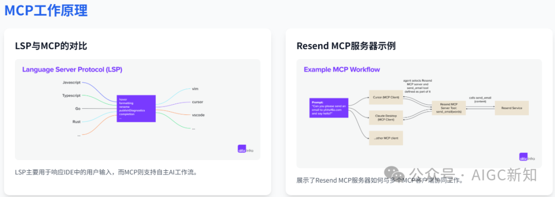 MCP 在LSP 的基础之上进行了扩展,特性是以 agent 为中心的执行模型:LSP 大多是反应性的(根据 IDE 中用户输入的请求进行响应),而 MCP 设计用于支持自主的 AI 工作流。