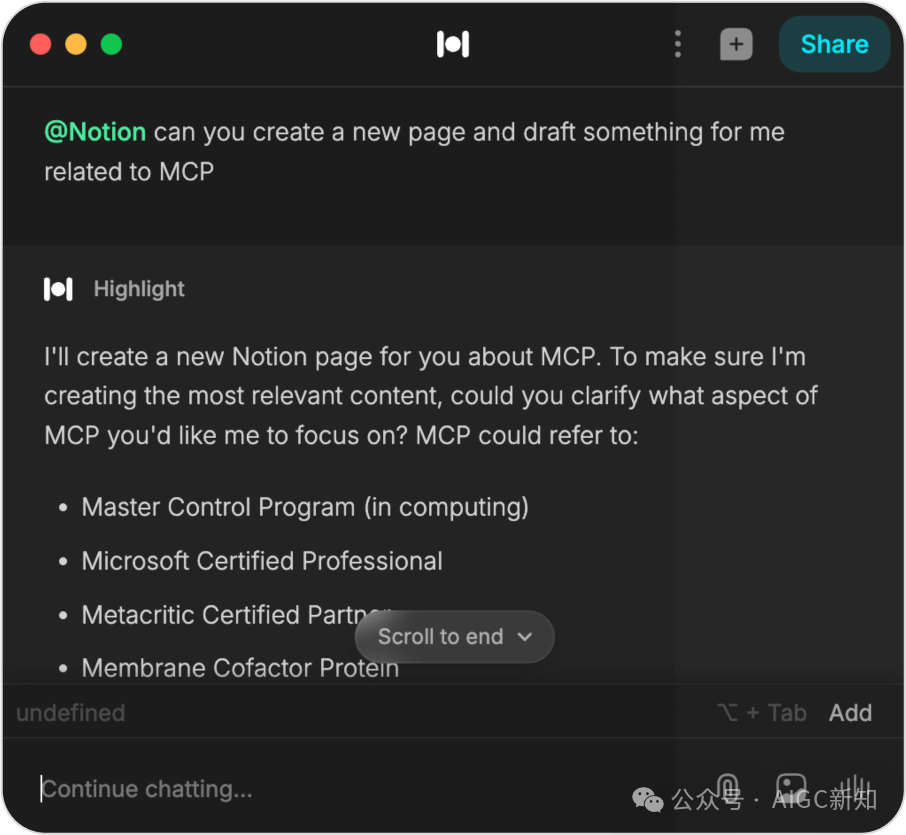 这一个例子是 Highlight 如何实现 @命令来调用其客户端上的任何 MCP 服务器。结果是一种新的用户体验模式,在这种模式中,MCP 客户端可以将生成的内容管道传输到任何下游应用程序中。