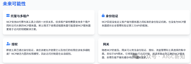 将出现一种新的托管模式,每个MCP客户端都将具有多步骤性质,并需要执行保证,如可恢复性、重试和长时间任务管理。托管提供商还需要在不同的 MCP 服务器之间进行实时负载均衡,以优化成本、延迟和性能,使 AI 代理能够在任何给定时刻选择最高效的工具。