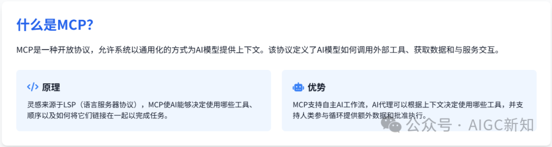 MCP 是一种开放协议,允许系统以通用的方式向 AI 模型提供上下文。 该协议定义了 AI 模型如何调用外部工具、获取数据以及与服务进行交互。