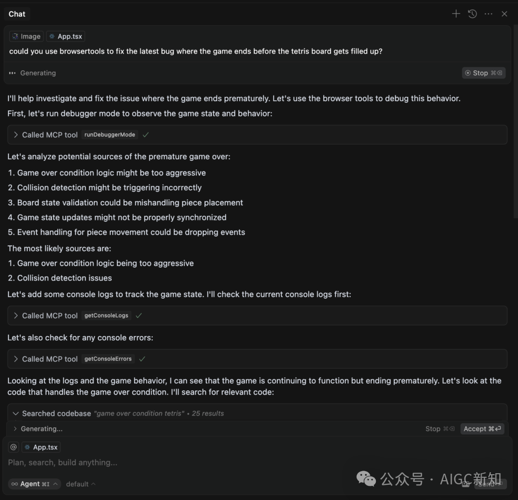 Cursor 代理如何使用 Browsertools 获取控制台日志和其他实时数据以更高效地进行调试的一个例子