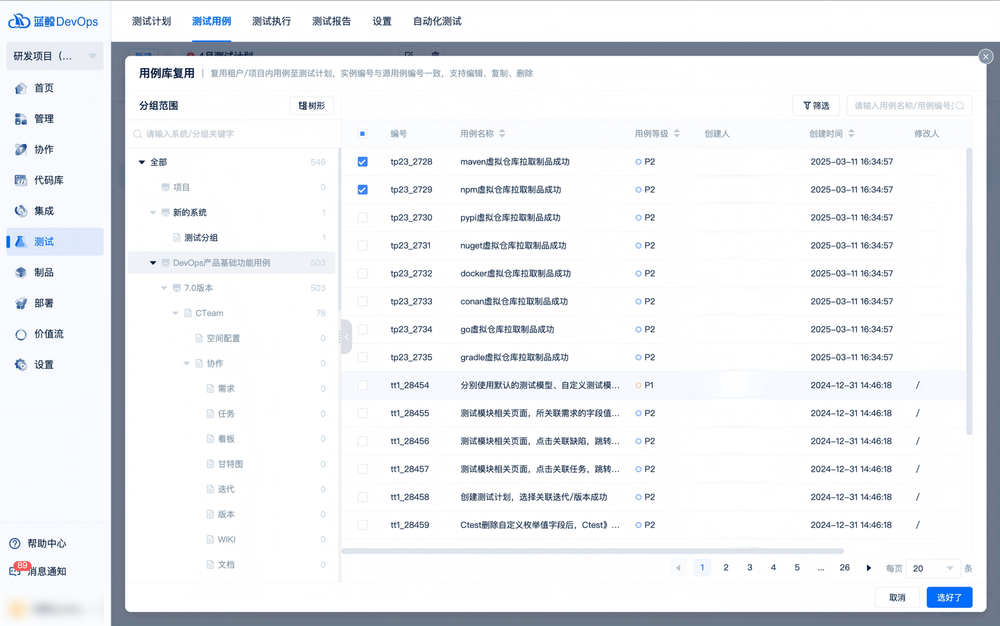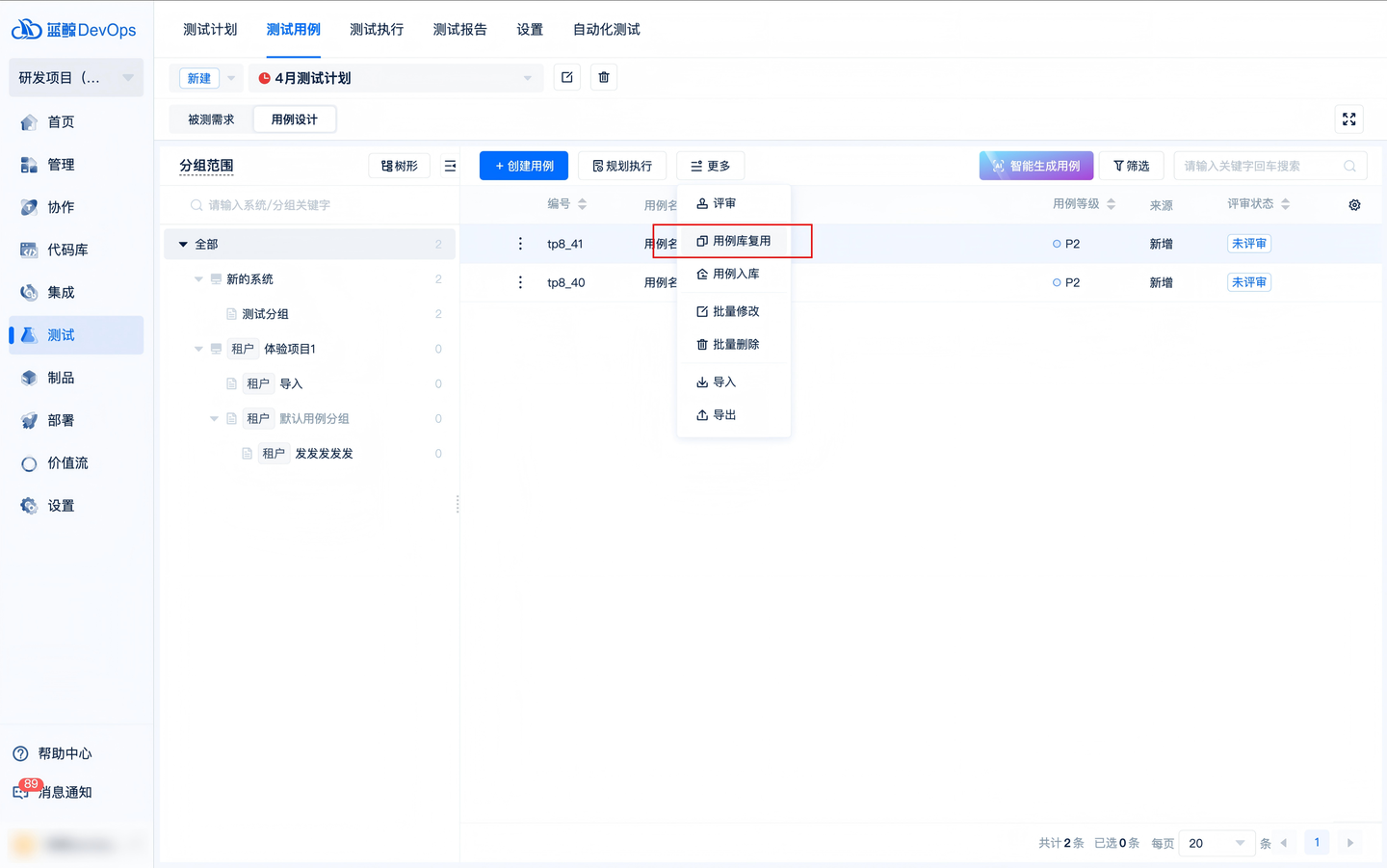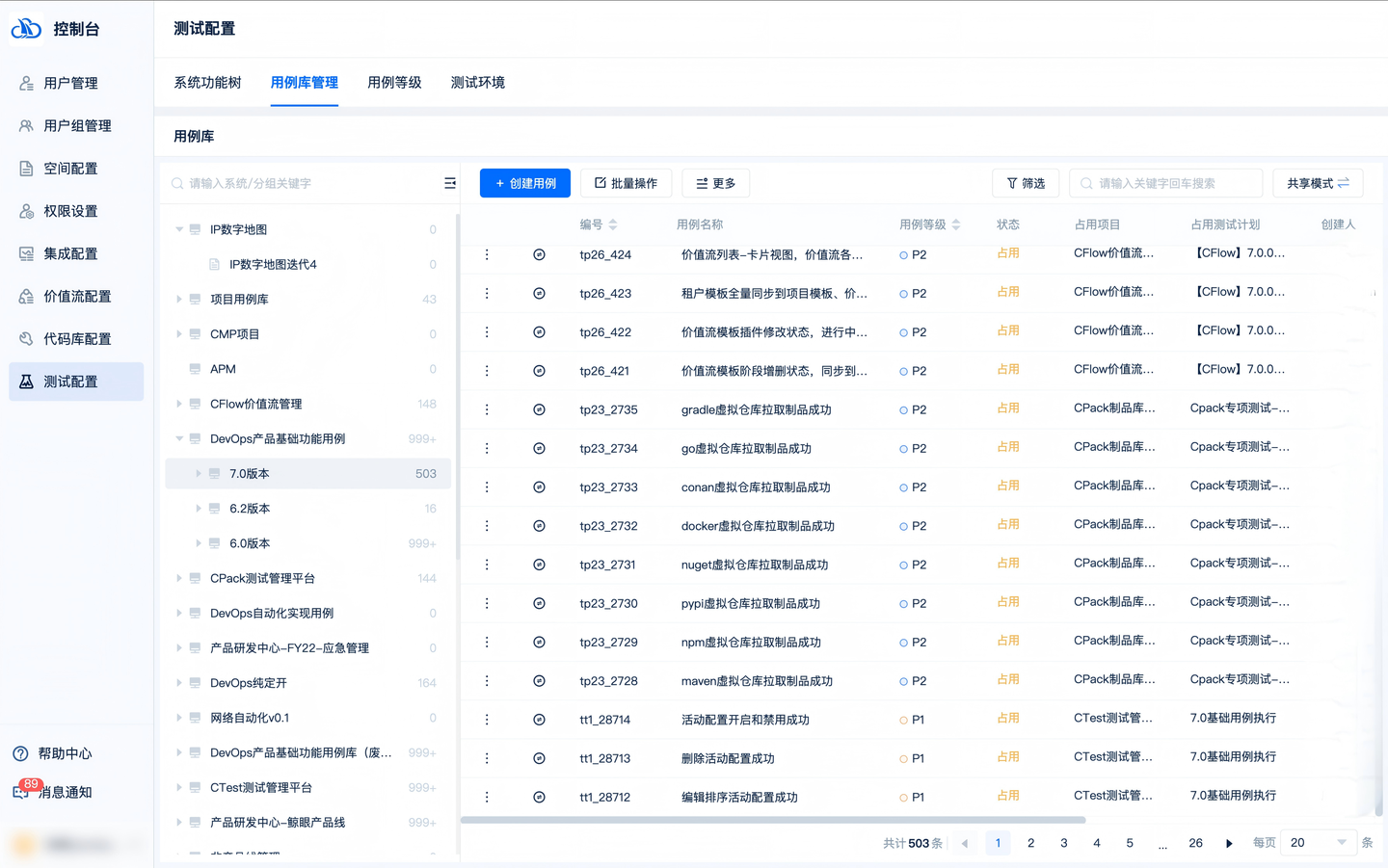 用例库管理即企业级的测试用例总和,测试团队在此持续更新、维护公共用例库,为后续的跨项目复用提供丰富的测试资产。