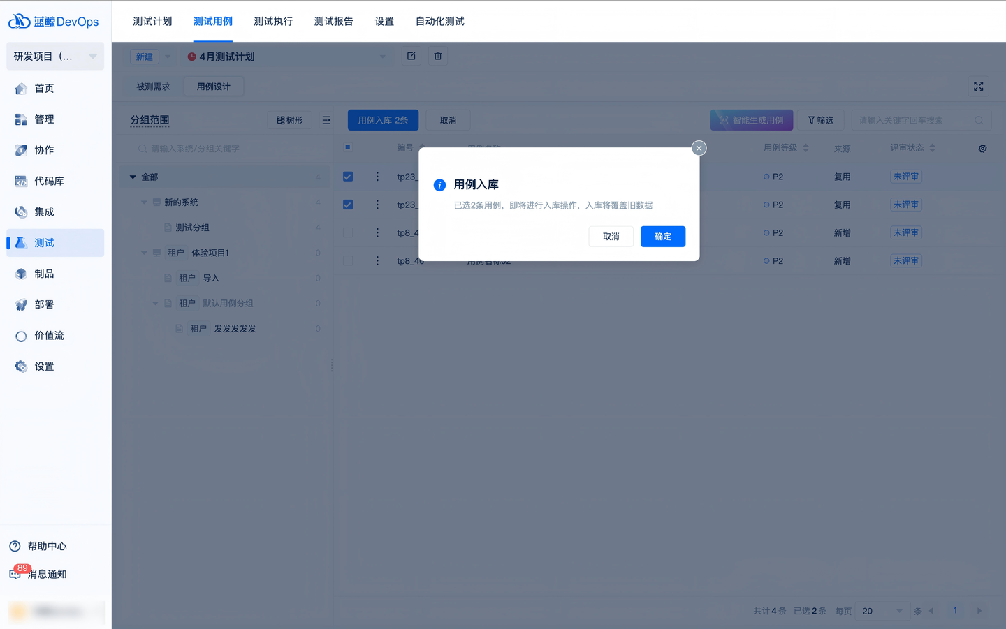 用例更新入库时将仅覆盖用例名称、等级、前置步骤、测试步骤、预期结果、附件,不会变更原有的分组信息,确保企业级用例的完整性和一致性。