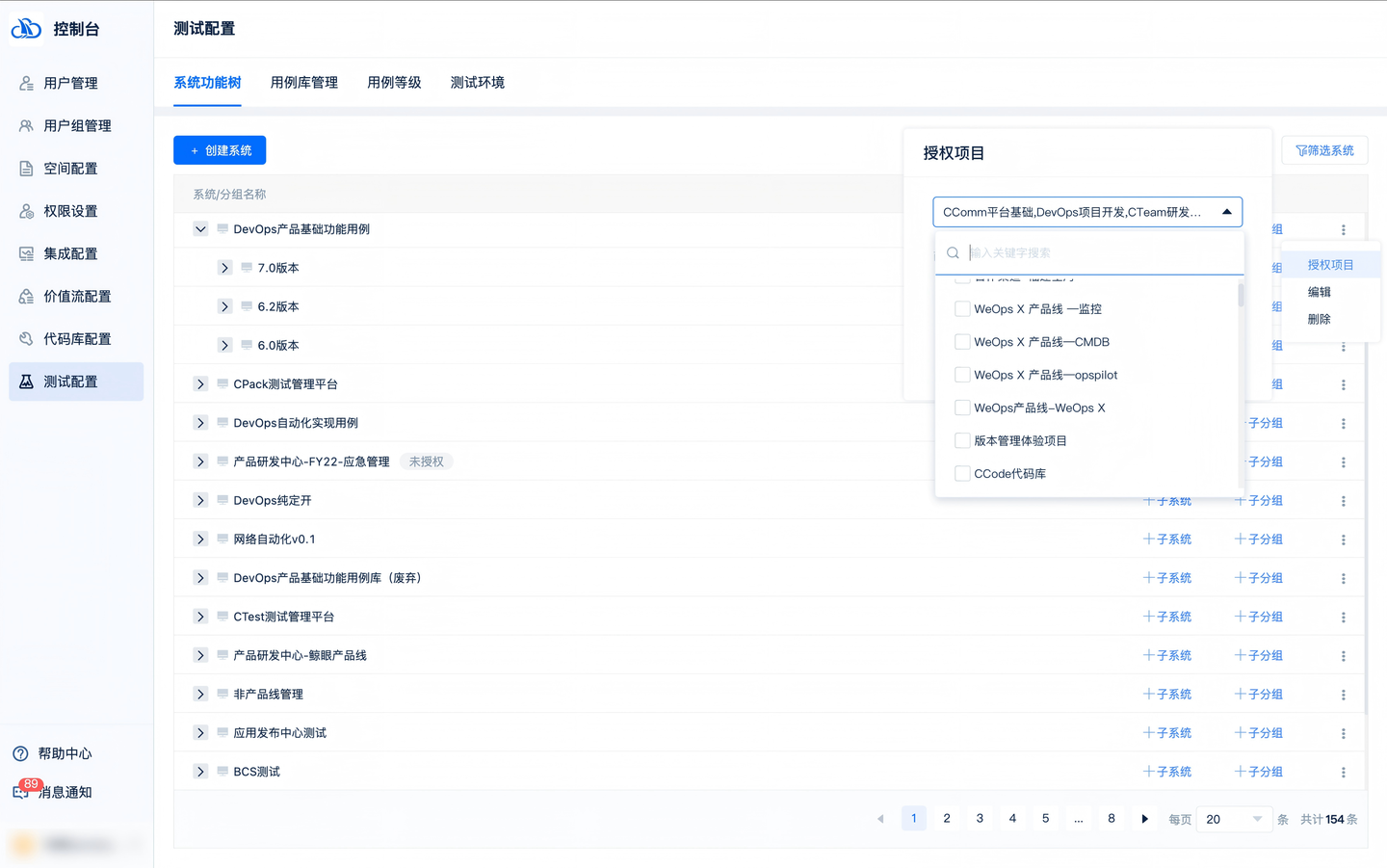系统功能树是指企业内部可测试的系统及系统下的功能模块,帮助测试团队对测试资产进行分级管理、项目授权,自上而下实现用例从企业级到项目级的复用路线。