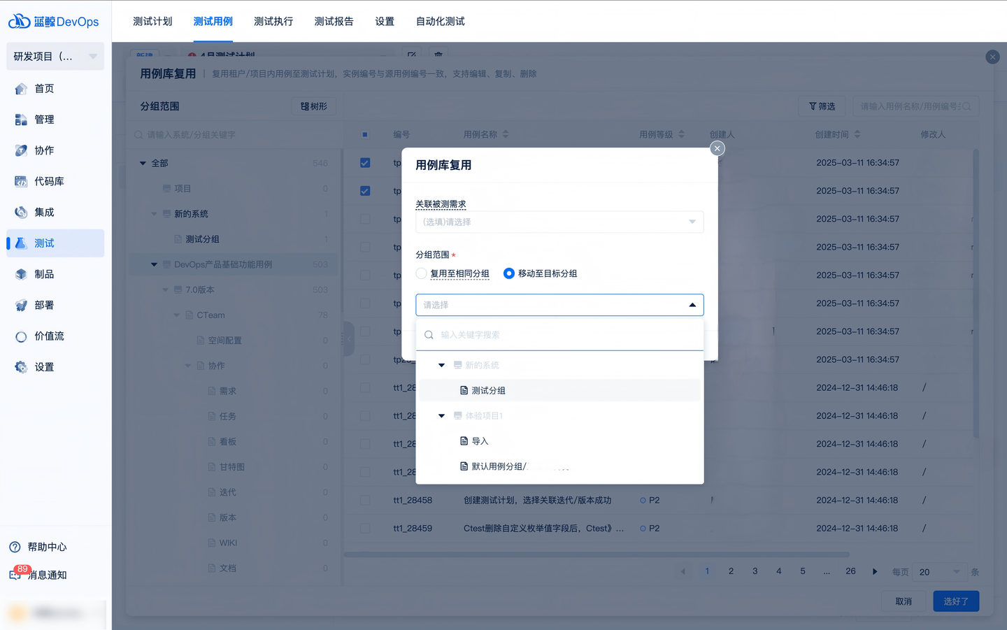 此外,测试团队之间可灵活复用企业级用例至指定项目内的测试计划,大大降低用例设计成本,节约测试人效。