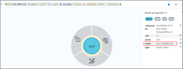 MATCH(m:Movie {name:'cncf'}) set m.scope='just a update test'
