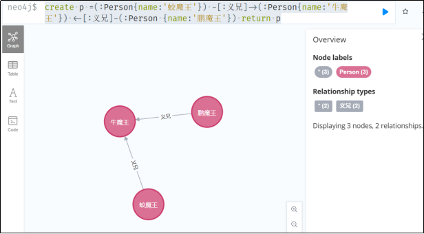 create p =(:Person{name:'蛟魔王'}) -[:义兄]->(:Person{name:'牛魔王'}) <-[:义兄]-(:Person {name:'鹏魔王'})