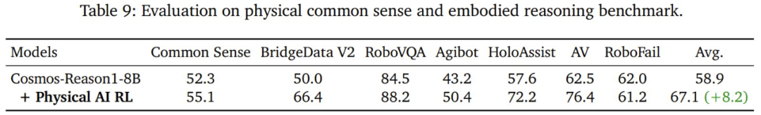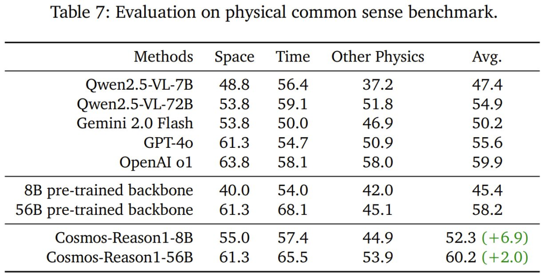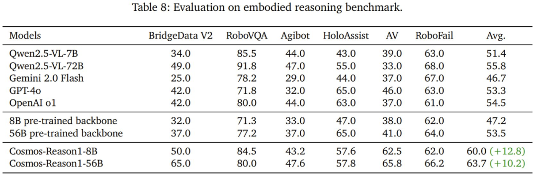 首先来看经过物理 AI 监督式微调后,Cosmos-Reason1 的物理常识表现。如表 7 所示,Cosmos-Reason1-8B 和 Cosmos-Reason1-56B 在各自的主干网络基础上都有明显提升,其中 56B 版本的准确度表现最好,甚至略微超过了 OpenAI ο1。