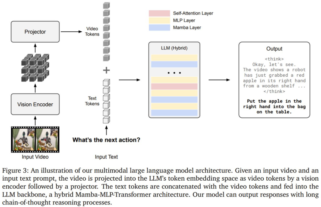 而今天我们介绍的 Cosmos-Reason1 系列模型则采用了 Mamba-MLP-Transformer 混合架构,如下图所示。