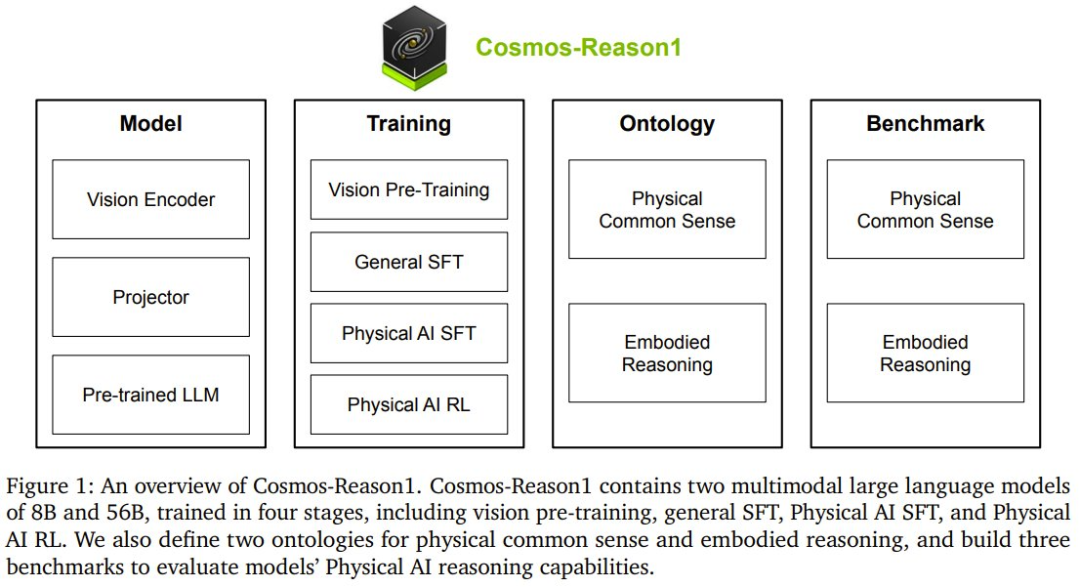 这两个模型都经过了四个阶段的训练:视觉预训练、通用 SFT、物理 AI SFT 和物理 AI 强化学习。此外,他们还为物理常识和具身推理定义了本体,并构建了用于评估多模态 LLM 的物理 AI 推理能力的基准。