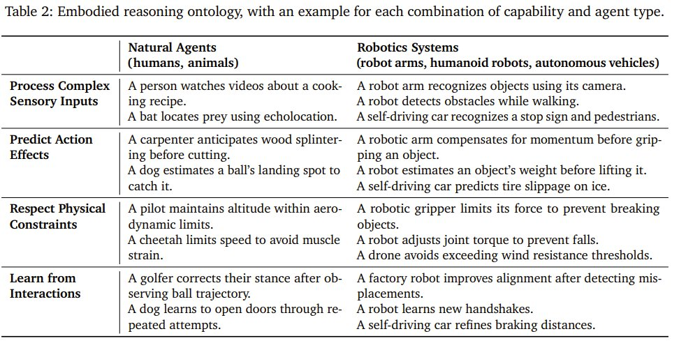 此外,该团队也定义了具身推理的本体论,其中涉及处理复杂的感官输入、预测动作效果、尊重物理约束、从互动中学习;详见下表。