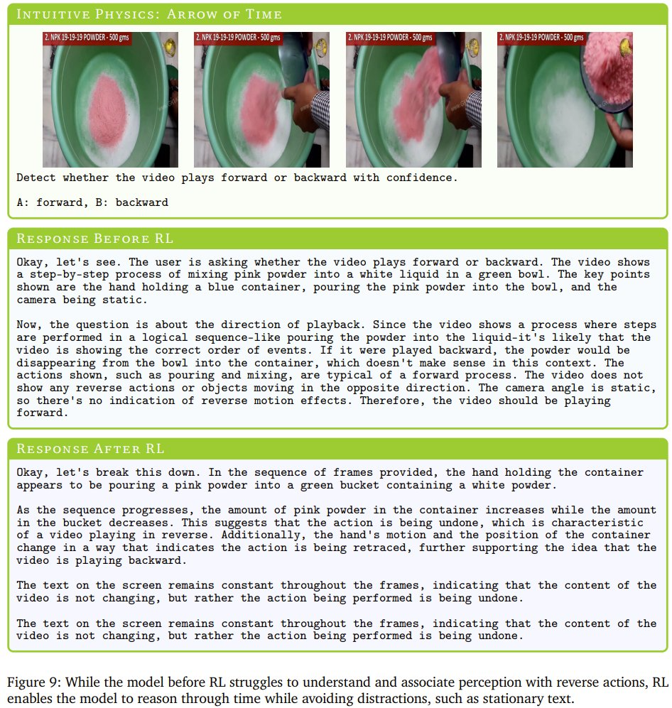 图 9 展示了在 RL 前后 Cosmos-Reason1 的时间推理能力的差异。可以看到,该模型能够识别反物理的运动 —— 例如粉末违背重力上升到碗中,同时不受视频中静止干扰物的影响。这表明它的推理不仅仅是感知。