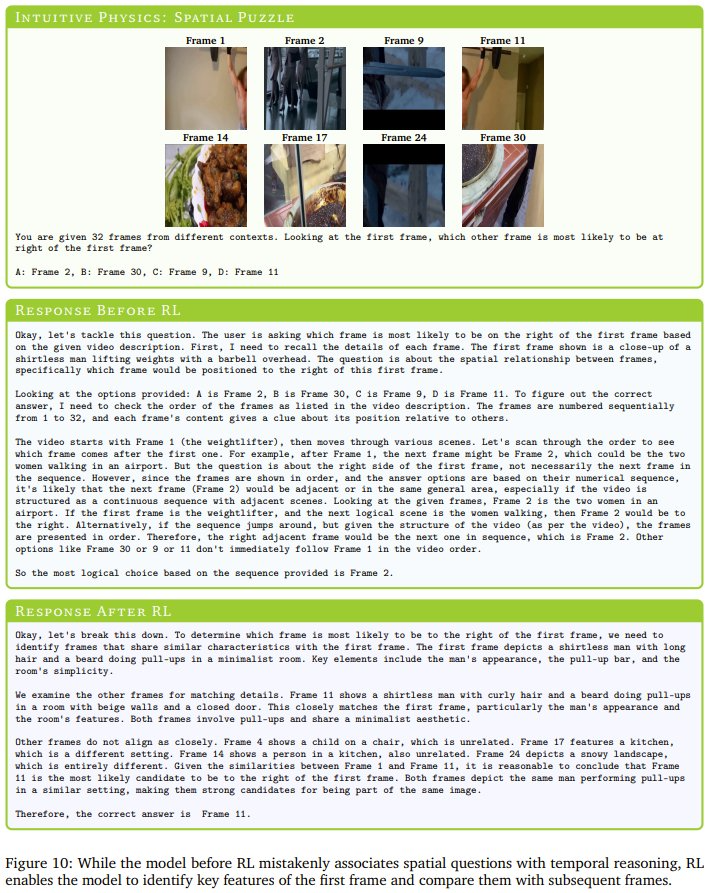 最后,图 11 表明,即使 CoT 较长,没有物理 AI RL 的模型也会难以理解物体持久性,经常难以推理物体的出现和消失。相比之下,经过 RL 的模型可通过直接而简洁的推理快速得出结论。