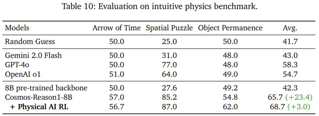 然而,该团队精心设计的直觉物理数据集可使 8B 模型能够在所有三个任务上有显著提升,就展现 Cosmos-Reason1 在直觉物理推理方面的基本能力。