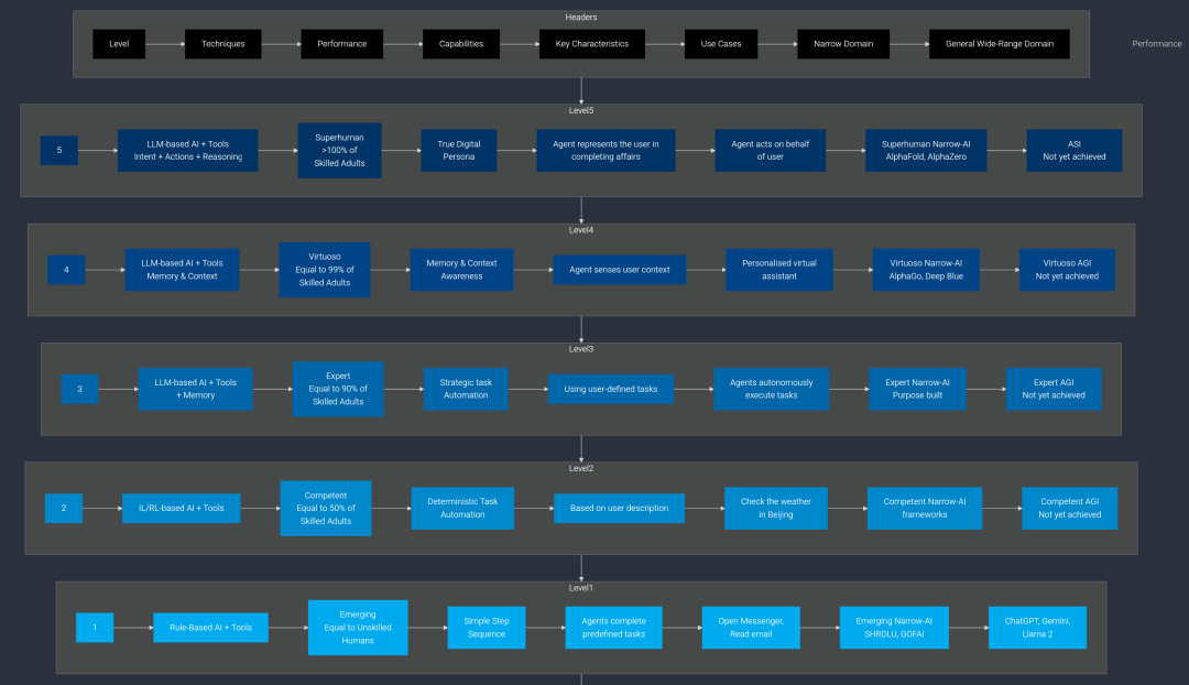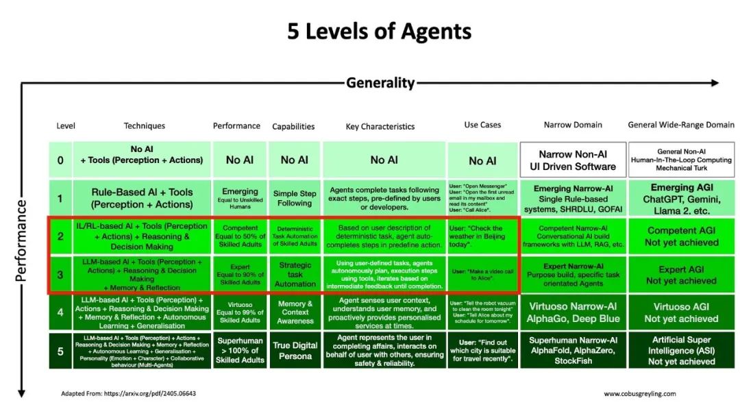 AI Agent可以分为五个等级的自主性,每一个等级代表独立行动和处理复杂任务的能力。