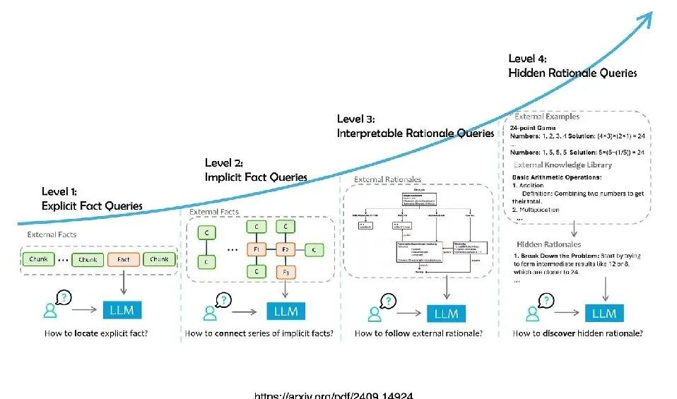 根据微软的研究,RAG 的能力可以按照搜索的复杂程度分为四个层次:显式事实查询、隐式事实查询、可解释的推理查询和隐式的推理查询。无论处于哪个层次,外部数据来源都起着关键作用。