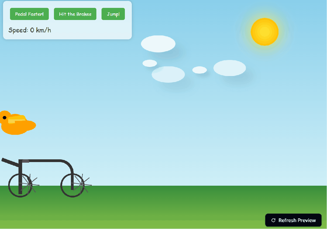 接着我们又输入:「编码一只骑自行车的鹈鹕,SVG。」后来因为轮子不转,我们又通过对话提示 AI,鹈鹕的脚应该和轮子联动,脚应该放在踏板上。结果,脚确实放在踏板上了,轮子也转了,而且可以调速度。但是,这个鹈鹕的位置还是很奇怪。