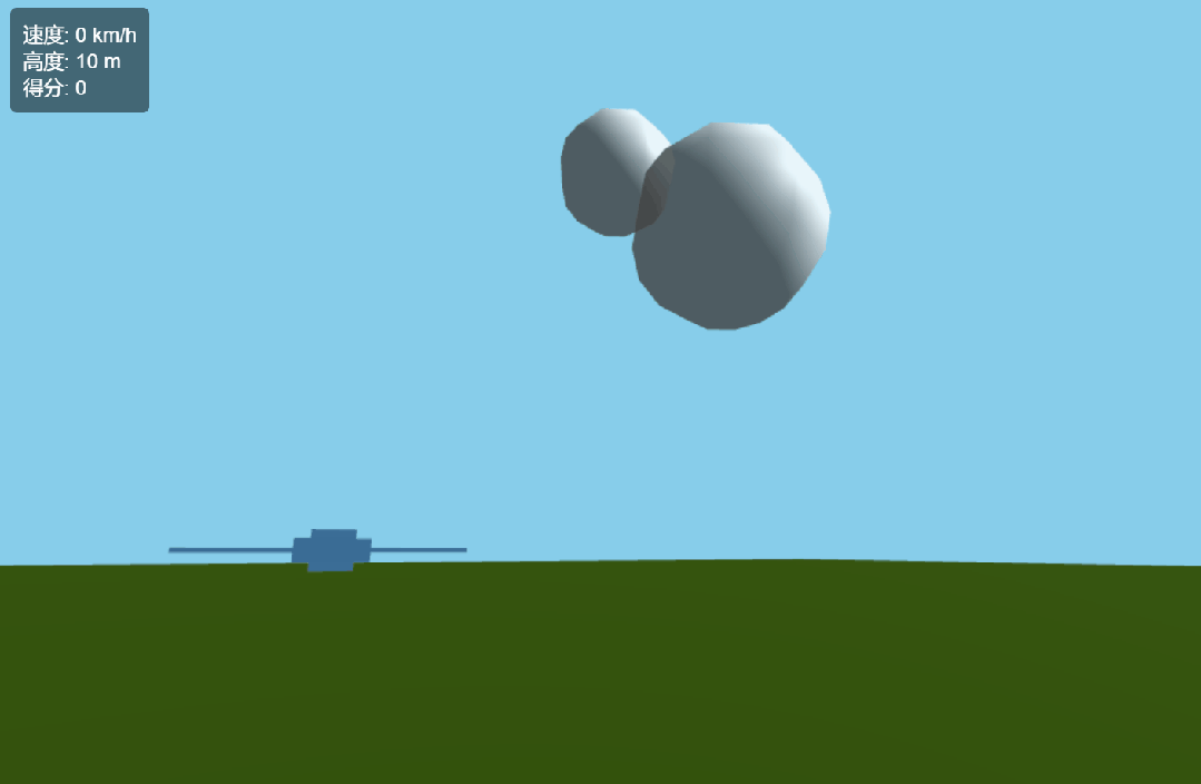 接下来,我们想要生成一个 3D 飞行模拟游戏。也是简单到只需要一句提示(帮我生成一个 3D 飞行模拟游戏)。只见 400 多行代码,嗖嗖的就跑完了,然后出现了如下右边界面。