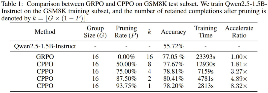 实验证明,他们的方法是有效的。当使用 Qwen-2.5 系列模型时(包括 Qwen-2.5-1.5B-Instruct 和 Qwen-2.5-7B-Instruct),在保证了准确度相当的基础上,CPPO 在 GSM8K 基准上的速度比 GRPO 快 8.32 倍,在 MATH 基准上快 3.51 倍。