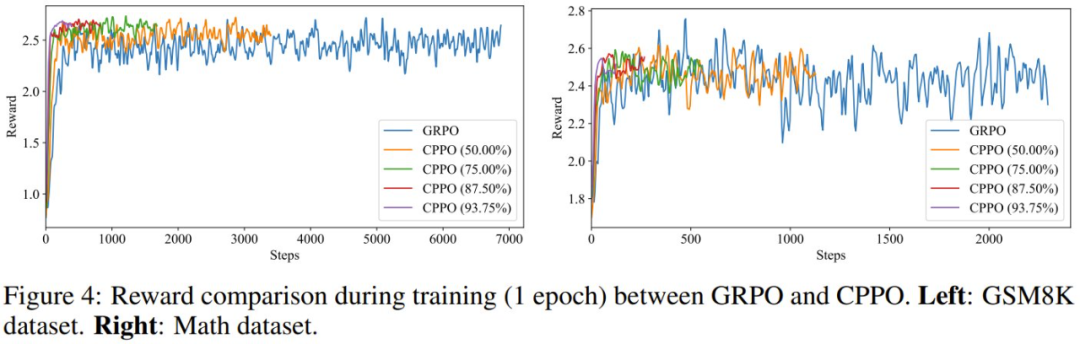 该团队也研究了 CPPO 的稳定性和收敛性。图 4 展示了在 GSM8K 和 MATH 数据集上训练时的奖励曲线。